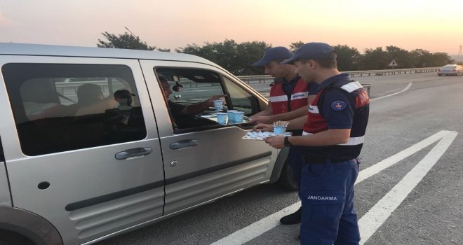 Bayram tatili dönüşünde evlerine ulaşabilmek için yollara düşen araç sürücüleri jandarma ekiplerinin denetimleri sayesinde kısa süreli dinlenme fırsatı bulurken yapılan ikramlarla da kendilerine geldi. Jandarma ekipleri sürücüleri trafik kurallarına uymaları konusunda uyarıp kısa bir mola verdirdikten sonra yola devam etmelerine izin verdi.