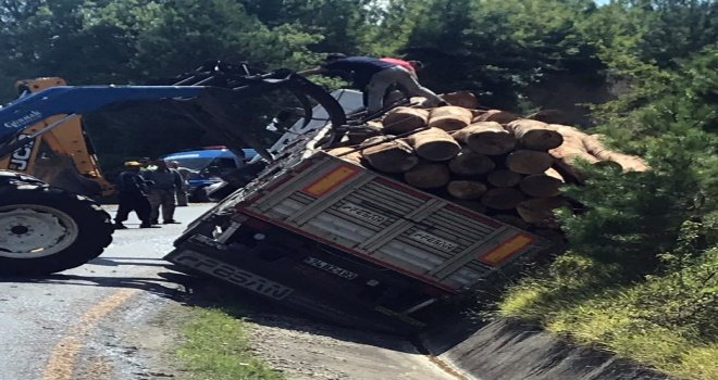 Bartında tomruk yüklü kamyon karayolunun kenarında bulunan kanala devrildi. Sürücünün 166 promil alkollü olduğu iddia edildi.