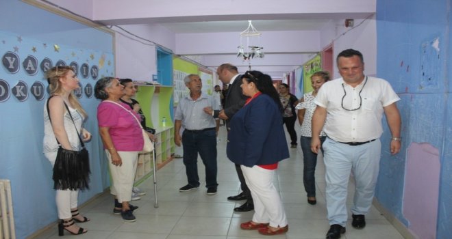 Ayvalıkta yeni eğitim ve öğretim yılının açılışına ait törenin Cuma günü yapılacağı öğrenilirken, ilk ders zilinin çalınmasıyla birlikte Ayvalık İlçe Milli Eğitim Müdürü Güner Bahadır, okulların ilk günü ile ilgili incelemelerde bulundu.