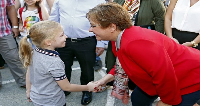 Konak Belediye Başkanı Sema Pekdaş, yeni eğitim-öğretim yılının ilk ders gününde Konak Belediyesi tarafından yenilenen okulları ziyaret ederek öğrenci ve öğretmenlere başarılar diledi. Pekdaş, bu yıl ilkokula başlayan miniklere içlerinde kırtasiye malzemelerinin bulunduğu okul çantaları armağan etti. Minik öğrenciler Başkan Pekdaşa sevgilerini sarılarak gösterdi.