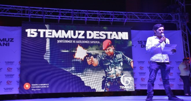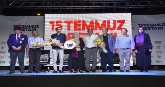 Gecenin sunuculuğunu yapan Ali Öztürkün okuduğu şiirin ardından ise İstanbulda o gece gazi olan Üzeyir Cihan, Vahide Şefkatoğlu, Halil İbrahim Sağlık, Sadık Beder sahneye gelerek o gece yaşadıklarını anlattılar. 15 Temmuzda eşi şehit olan kendisi de gazi olan Vahide Şefkatoğlu yaptığı konuşmada, “Ogün evimizi boyamıştık. Akşamına bir yakınımdan darbe girişi olduğu haberini aldım ve eşimle birlikte hemen yollara düştük. Önce Dörtyola doğru gittik. Sonrasında, “Atışalanında toplanılacak” dediler. Bir anda müthiş bir kalabalık oldu, bayraklardan her yer kıpkırmızıydı. Gençlerin Allahuekber sesleri kulağımızdaydı. O kadar kalabalıktık ki, “Allahın izniyle bu ülke yıkılmayacak. Ne kadar da çok imanlı gençlerimiz varmış” dedim. Eşimle Atışalanına gittik. Orada görevli biri, “Burayı koruma altına aldık, havalimanına gideceğiz” dedi. Ondan sonra oğlum karşı tarafa dayısının yanına, tankların olduğu yere geçti. Tekrar havalimanına doğru yürümeye başladık. Eşim, “Sen eve geç, yol çok uzun, yorulursun” dedi. “Hayır, bu yolda ölmek var, dönmek yok” dedim. Havalimanına doğru giderken yol ikiye ayrılıyordu. “Nereden gidelim” diye düşünürken, “Bariyerlerin altından geçer, otobandan gideriz” dedik. Oradan atlayıp geçtik ve 15-20 dakika yürüdük. Birden, “Ateş ediyorlar” diye bağırmaya başladılar. Tankın önünden ateş ediyorlardı, millet neye uğradığını şaşırdı. Herkes bir yerlere atlamaya başladı. Eşim, “Bariyerlerin üstünden atlayalım” dedi. “Kiloluyum atlayamam, sen atla ben alttan geçerim” dedim. Eşim bariyerlerin üstüne ayağını koydu, benim de elim alttaydı. Tank o an üzerimizden geçti. Sonrasında beni hastaneye kaldırmışlar. Kendime geldiğimde ilk sorduğum şey vatan oldu. Daha sonra ise eşimi sordum. Onun durumu senden daha da ağır dediler. Sonrasında öğrendim ki eşim şehit olmuş. Evet eşim şehit, ben gazi oldum. Ne büyük bir şeref düşünebiliyor musunuz” dedi.