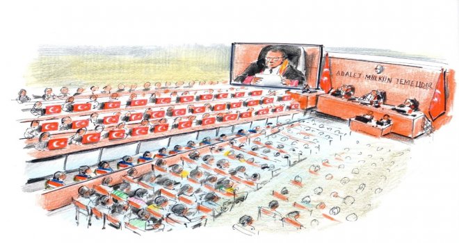 15 Temmuz Şehitler Köprüsü davasında karar açıklanıyor. Mahkemede 34 şehidi temsil eden 34 Türk bayrağı salonda yer alırken salon karakalem ile resmedildi.