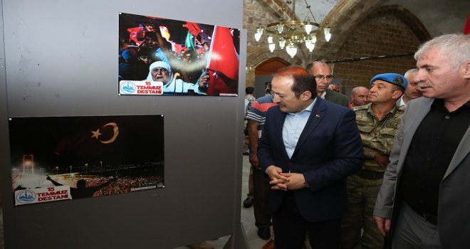 Mevlidin ardından Taşhanda Anadolu Ajansına ait o gece yaşananlara ilişkin çarpıcı karelerin yer aldığı 15 Temmuz Resim Sergisi ziyarete açıldı. Sergi açılışına katılan Vali Pehlivan fotoğrafları inceleyerek ilgilerden bilgiler aldı.