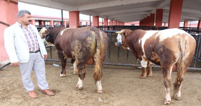 Ağrı Hayvan Pazarında elinde bulunan büyükbaş kurbanlıkları satmak isteyen Faruk Karataş, 25 bin lira fiyat verdiği 800 kilo ağırlığında olan simental danayı alana bir simental dana hediye ediyor.