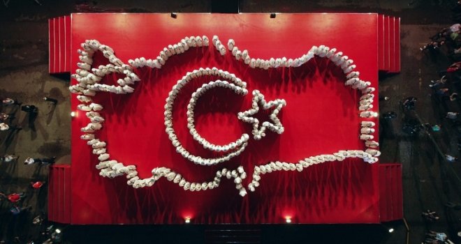 Kocaelinin İzmit ilçesinde 15 Temmuz etkinlikleri kapsamında 81 ilden gelen 251 hafız bedenleriyle Önce Vatan Dediler yazarak Türkiye haritası oluşturdu.