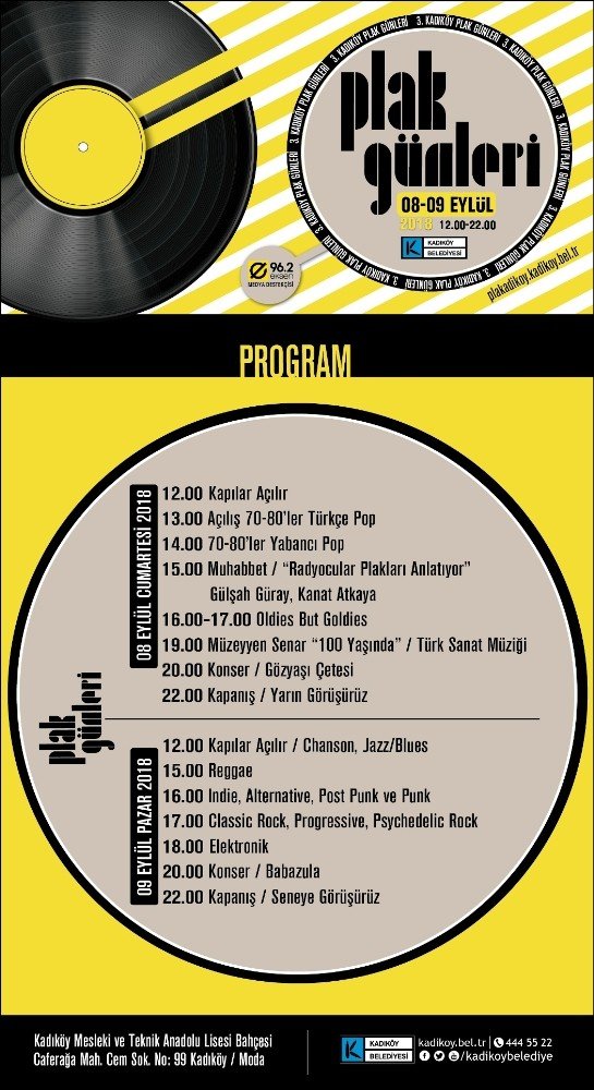 Taş plaklar, kasetten, CDye, MP3ten, dijital müzik platformlarına doğru yol alan müzik endüstrisinin görkemli başlangıcı oldu. Müzik formları ve türleri değişse de müzikseverlerin gönlündeki yerini korudu. Kadıköy Belediyesi geçen 2 yılda olduğu gibi bu yıl da İstanbulun önemli plakçılarını plakseverlerle bir araya getiriyor. Plak müdavimlerinin buluşacağı Kadıköy Plak Günlerinde plak stantlarının yanı sıra plakla ilgili söyleşiler, imza günü ve konserler olacak.