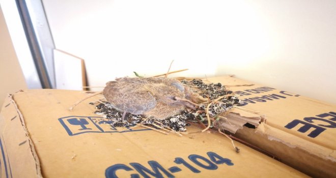 Üveyik kuşu, penceresi açık ofise girerek kutuların üzerine yuva yaptı.
