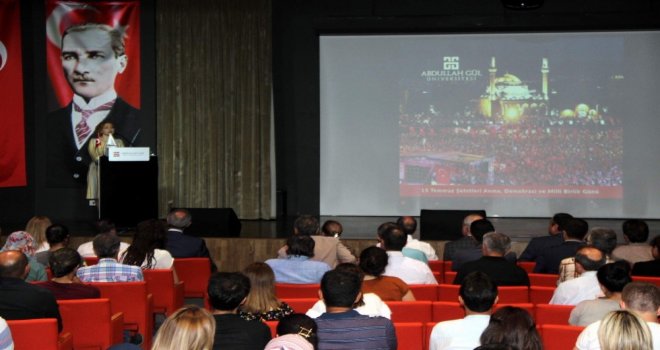Abdullah Gül Üniversitesi (AGÜ) tarafından düzenlenen 15 Temmuz Şehitlerini Anma, Demokrasi ve Milli Birlik Günü programında konuşan Rektör Prof. Dr. İhsan Sabuncuoğlu, Bütün bunlardan ders çıkartarak buna benzer örgütlerin de oluşumunu önlememiz lazım. Tarih; tekerrürden ibarettir, geçmişte yaşananlar gelecekte de yaşanır. Ama bunlardan iyi ders çıkartıp önlemler alırsak benzer bir takım örgütlerin oluşmasına izin vermememiz lazım dedi.