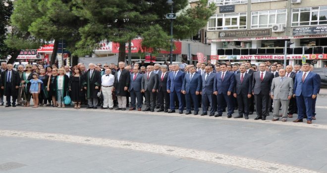 Saygı duruşu ve İstiklal Marşının ardından, Samsun Barosu, Samsun İdari Yargı, Samsun Adliyesi ve Samsun Noter Odası çelenkleri Atatürk Anıtına sulundu. Çelenk töreninin ardından Samsun Adliyesi Cumhuriyet Savcısı İsa Fidan Konferans Salonunda açılış konuşmaları yapıldı.