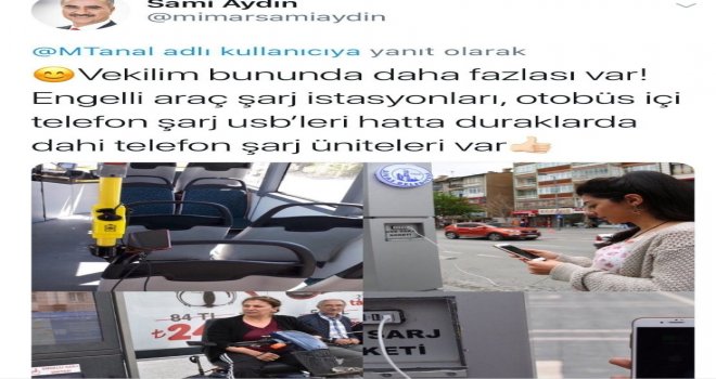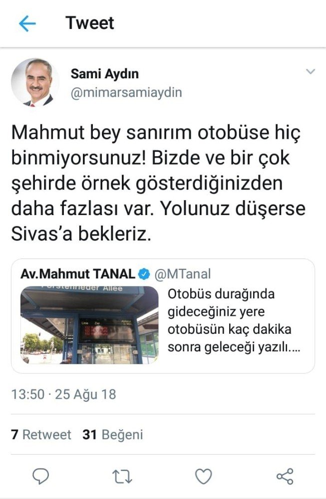 CHP Milletvekili Mahmut Tanal, Almanyada bindiği otobüsteki telefon şarj hizmetini fotoğraflayarak twitter hesabından, Almanyada belediye otobüslerinde cep telefonu şarj etme hizmeti sunuluyor şeklinde paylaştı. Sivas Belediye Başkanı Sami Aydın, Sivas Belediyesi otobüslerindeki hizmetleri paylaşarak tweeti,”Mahmut bey sanırım otobüse hiç binmiyorsunuz. Bizde birçok şehirde örnek gösterdiğinizden daha fazlası var. Yolunuz düşerse Sivasa bekleriz şeklinde cevapladı.