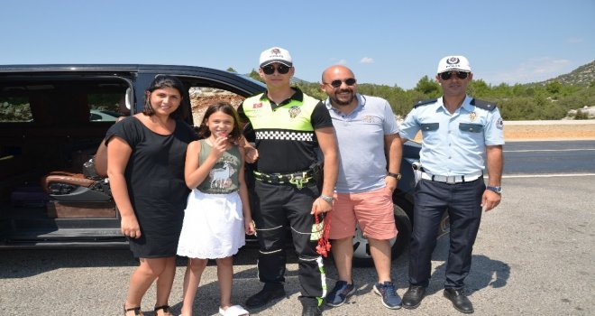 Ekipler ayrıca durdurdukları araçtaki çocuklara sürücünün trafik kuralı ihlali yapması halinde kullanmaları için kırmızı renkli düdük ve broşür hediye etti.