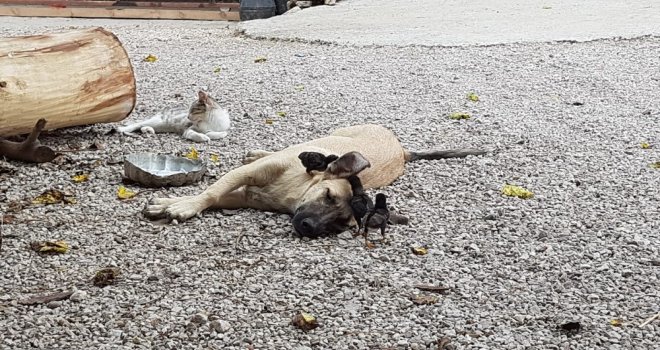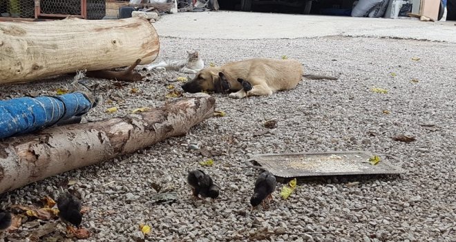 Osmaniyenin Sumbas ilçesinde, otomobil çarpması sonucu ölen tavuğun 6 civcivine evin Aslan ismindeki köpeği sahip çıkarak annelik yapıyor. Daha önce evin kedisini de büyüten Aslanı civcivler ise annesi zannediyor.