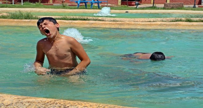 Hava sıcaklığının 30 derecenin üstüne çıktığı Antalyada, sıcaktan bunalan çocuklar serinlemek için değişik yöntemler buluyor. Yaşları 9-12 arasında değişen çocuklar, Yenigün Mahallesindeki bir süs havuzunda gönüllerince eğleniyor. Etrafı taşlık olan havuz kenarında akrobatik hareketler yapan çocuklar, suyun kirli olmasına aldırış etmeden saatlerce yüzüyor. Uzun süre havuzda kulaç atan çocuklar, fıskiye boruları ile elektrik kablolarını da umursamıyor.