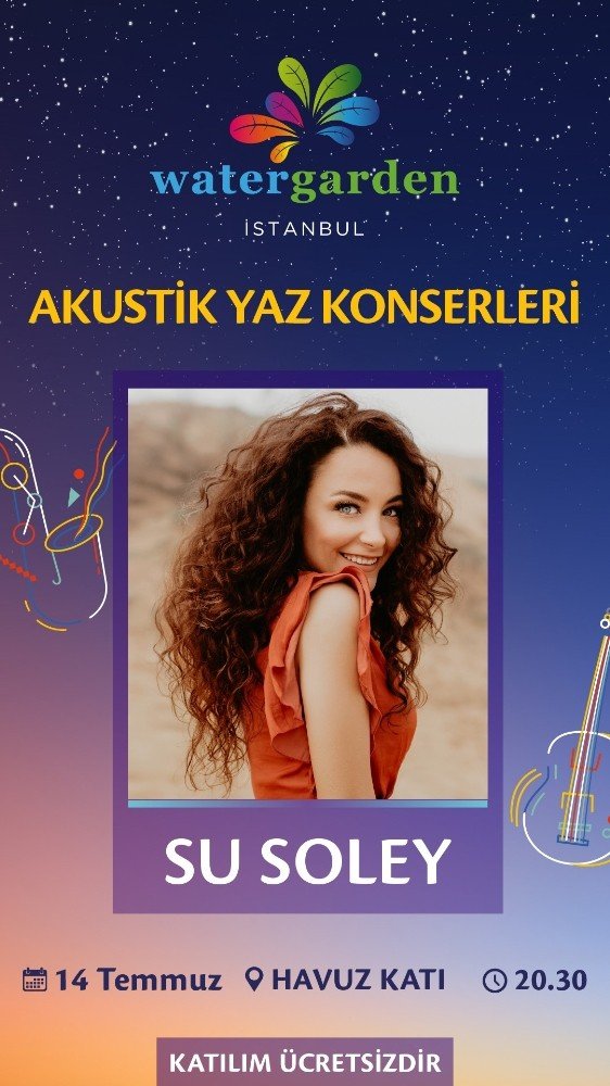 Ataşehirdeki Watergarden İstanbulda Akustik Yaz Konserleri başlıyor. Eşsiz havuz şovları eşliğinde her cumartesi gerçekleşecek konser programının ilk konuğu Haziran ayında piyasaya çıkan Hep Bi Tufan albümüyle müzikseverlerden tam not alan Su Soley olacak. Cumartesi günü 20.30da sahne alacak Su Soley, Bu Yaz, Anladın mı? Yap Bi Numara gibi bestelerinin yanı sıra, en beğenilen yabancı şarkılarını canlı akustik performansı ile müzikseverler ile buluşturacak. Havuz şovlarının renkli atmosferi altında ücretsiz gerçekleşecek konser programları Eylül ayına kadar devam edecek.