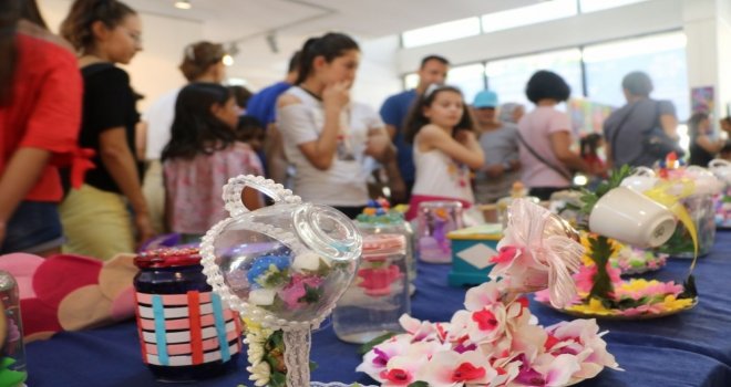 Büyükşehir Belediyesi bürokratları ve çocuklar tarafından kesilen kurdeleyle açılan sergide, çocukların ve yetişkinlerin yaz boyu düzenlenen kurslarda yaptıkları işler sergileniyor.
