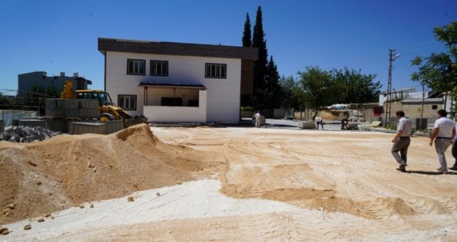 Adıyaman Belediyesi tarafından Bahçecik Mahallesinde bitme aşamasına gelen taziye evinin çevre düzenlemesi yapıyor.