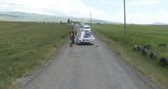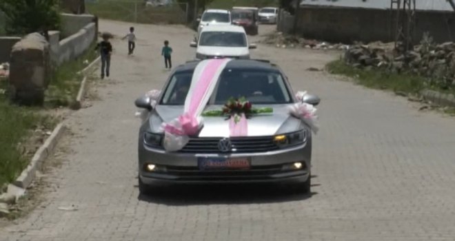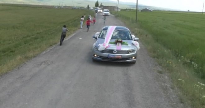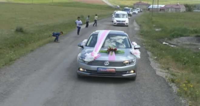 Ağrıda gelin arabalarından bahşiş almak isteyen çocuklar, trafikte seyir halindeki düğün konvoyunun önüne atlayarak canlarını tehlikeye atıyor.
