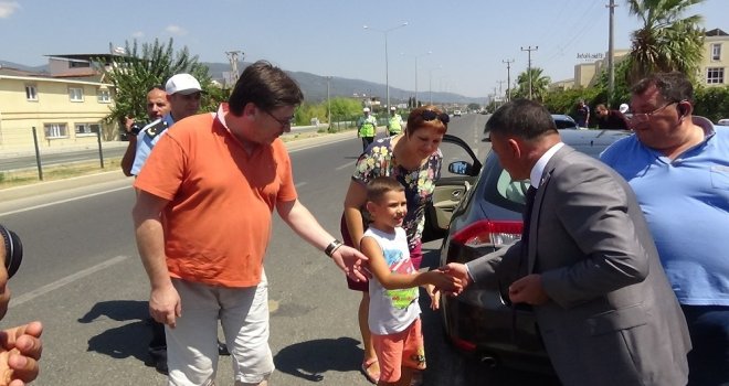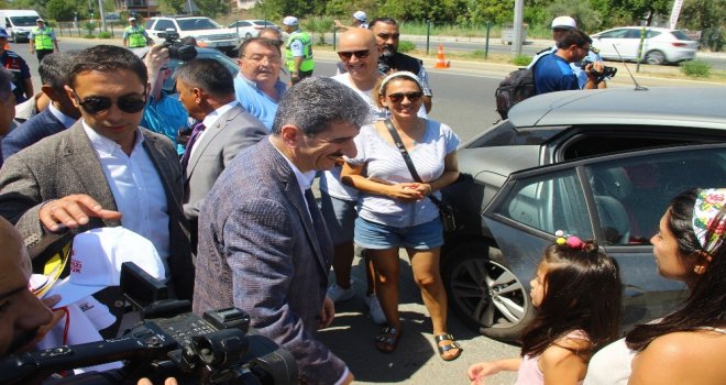 Beraberinde Balıkesir Valisi Ersin Yazıcı, Edremit Kaymakamı Ali Sırmalı, İl Jandarma Komutanı Kıdemli Albay Murat Kınay, Edremit Emniyet Müdürü Zafer Sönmez, İlçe Jandarma Komutanı Jandarma Yüzbaşı Özkan Kavak ile birlikte uygulamaya katılan İçişleri Bakan Yardımcısı Muhterem İnce, durdurdukları araçlardaki çocuklara broşür, şapka, tişört ve kırmızı düdük dağıttı.