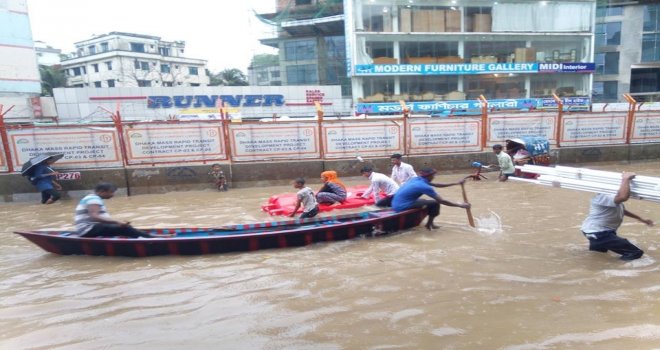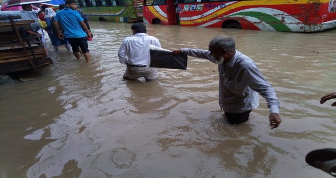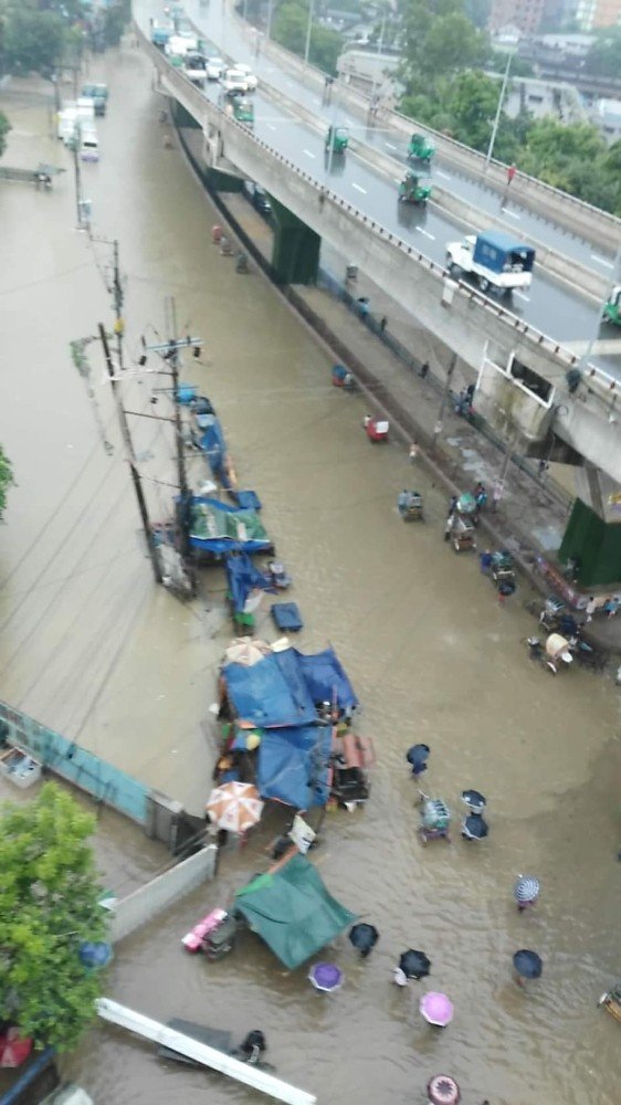 Bangladeşte son bir haftadır sıcaklık 35 dereceye kadar yükseldikten sonra dün başlayan yağmur dinmeden şimdi taşkına neden oldu.