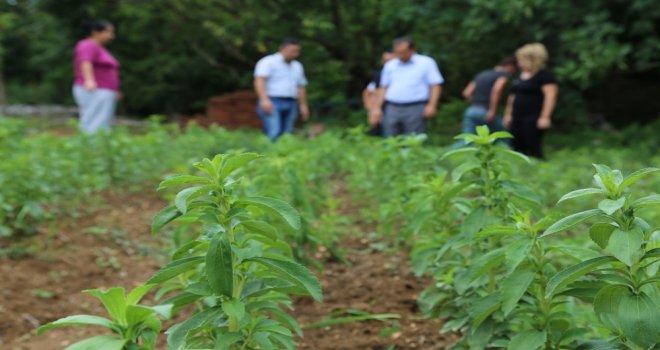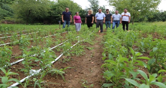 İncelemede konuşan Müdür Bayram, “Stevia (Şeker otu), yapraklarındaki doğal özler sayesinde kurutma işlemi görmüş olan yapraklar kristal şekerden işlenmemiş olarak 10-15 kat, işlenmiş olarak ise 200-300 kat daha fazla tatlandırıcı özelliğe sahip bir bitkidir. Stevia bitkisinin tıp, eczacılık, gıda koruma gibi birçok alanda kullanılabilirliğine ilişkin çok sayıda araştırma vardır. Özellikle doğal bir tatlandırıcı olduğu için geleceğin tatlandırıcısı gözüyle bakılmaktadır. Stevia bitkisinin uygun koşullarda boyu 1mye yaklaşabilir. Yılda iki üç defa hasat edilebilirken 1 dekarlık stevia tarlasından 3 hasatta toplam 400-500 kg kuru yaprak elde edilebilmektedir. Yüksek gelirli ve karlı bir iş olan stevia bitkisinin kurutulmuş olarak kilogramı 120 TL-150 TL arası satılmaktadır. İlimizde yapılan deneme sonucu adaptasyon aşamaları İl Müdürlüğümüz konu sorumlusu teknik personellerce takip edilmektedir. 6 yıl ömrü olan bitkinin hasadı gövdesinden 10 cm kadar üstten keserek yapılır. Sonra kurutma işlemi gerçekleştirilir. Kesilen dalların yerlerinden tekrar çıkış yapmaktadır. Ayrıca kurulan bahçede organik tarım üretimi yapılmaktadır” dedi.