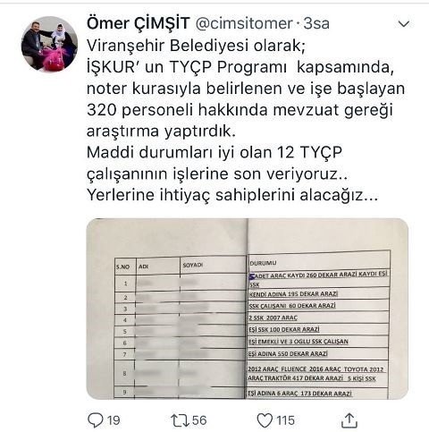 Viranşehir Kaymakamı ve Belediye Başkan Vekili Ömer Çimşit,sosyal medya hesabından yaptığı açıklama maddi durumu iyi olan şahısların işine son verildiğini açıkladı. Geçtiğimiz günlerde noter huzurunda yapılan çekiliş ile yüzlerce işçi İşkur bünyesinde işe alındı. Kamu kurum ve kuruluşlarında işe başlayan işçilerin gelir incelemeleri yapıldı. Yapılan inceleme neticesinde tarla ve arabası bulunan, eşi sigortalı çalışan 12 kişinin işine son verdi. 0nların yerine Mağdur vatandaşlar için başlatılan projede hak sahiplerinin çalışmasının önü açıldı. Kaymakam Çimşit yaptığı açıklamada, Viranşehir Belediyesi olarak, İŞKUR un TYÇP Programı kapsamında, noter kurasıyla belirlenen ve işe başlayan 320 personel hakkında mevzuat gereği araştırma yaptırdık. Maddi durumları iyi olan 12 TYÇP çalışanının işlerine son veriyoruz. Yerlerine ihtiyaç sahiplerini alacağız diye konuştu.