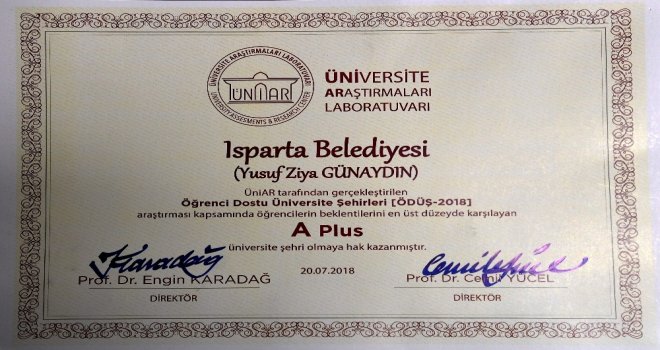 Isparta Belediye Başkanı Yusuf Ziya Günaydına,Üniversite Araştırmaları Laboratuvarı (ÜniAr), tarafından gerçekleştirilen Öğrenci Dostu Üniversite Şehirleri (ÖDÜŞ-2018) araştırması kapsamında,öğrencilerin beklentilerini en üst düzeyde karşılayan A Plus üniversite şehri olma ödülü verildi.