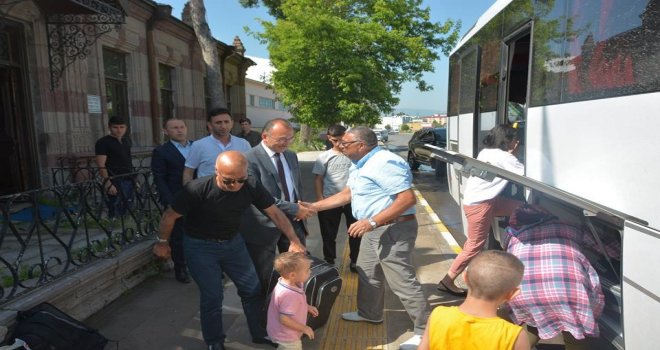 Otobüslerle Ardahana gelen 300 kişiyi Tarihi Kongre Binasında karşılayan Faruk Köksoy, tek tek görüştüğü hemşerileriyle sohbet etti, hasret giderdi.
