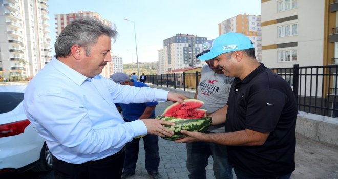Çalışmalar hakkında bilgi alan Başkan Palancıoğlu, sıcakta özveriyle çalışan İşçilere serinlemeleri ve enerji sağlaması için karpuz ikram etti.