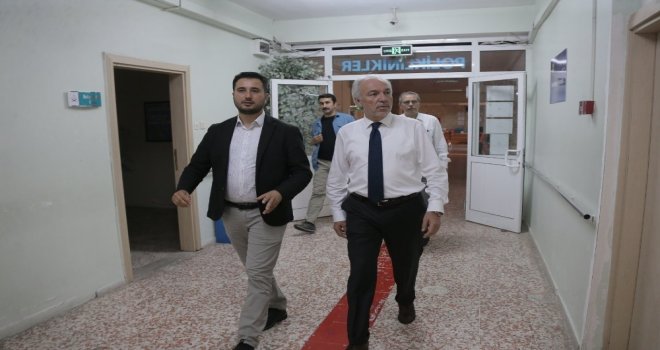 Yoncalı Fizik Tedavi ve Rehabilitasyon Hastanesini Gökpınar ile birlikte gezerek incelemelerde bulunan Saraçoğlu, hastane personeliyle sohbet etti.