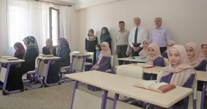 Sohbet ortamında gerçekleşen ziyarette incelemelerde bulunarak, yaklaşık 100 öğrenci ile bir araya gelen Belediye Başkanı Kamil Saracoğluna, İl Müftüsü Hüseyin Hazırlar eşlik etti. (EFE)