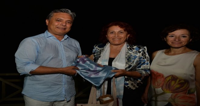 Gecenin sonunda Kuşadası Belediye Başkan Yardımcısı Ayşe Şerifoğlu, belediyenin öncülüğünde kadınların el emeklerini değerlendirmelerini sağlamak ve kadınlara istihdam olanağı oluşturmak amacıyla kurulan KUŞAKKın el baskısı yöntemiyle üretilen ve üzerinde ilçenin tarihi evlerinde bulunan çatı kuşu motifinin yer aldığı şal ve bez çantayı Başkan Uysala hediye etti.