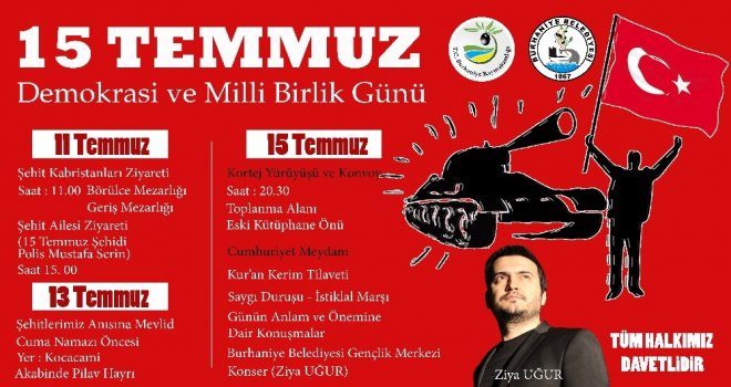 15 Temmuz Pazar günü gerçekleşecek etkinlikler ise saat 20.30da, Eski kütüphane önünden Cumhuriyet Meydanına yapılacak konvoy ve kortej yürüyüşüyle başlayacak. Meydandaki etkinlikler; Kuran-ı Kerim tilavetinin ardından, günün anlam ve önemine dair konuşmalar ile Burhaniye Belediyesi Gençlik Merkezi Konseri (Ziya Uğur) ile devam edecek.