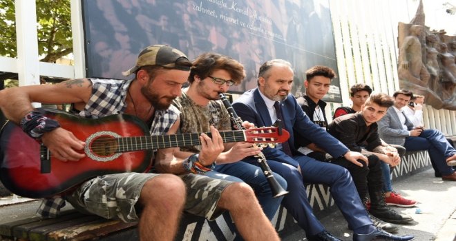 Bursa Büyükşehir Belediye Başkanı Alinur Aktaş, Kent Müzesi önünde karşılaştığı gençlerle müzik sohbeti yaptı, söylenen şarkılara eşlik etti.