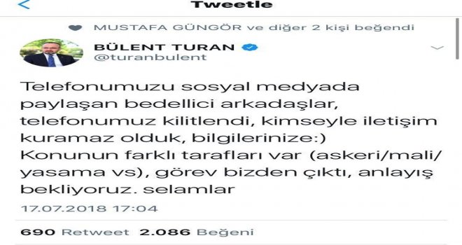Açıklamasının ardından Turanın telefonu kilitlendi. Konuyla ilgili twitterdan açıklama yapan Turan, Telefonumuzu sosyal medyada paylaşan bedellici arkadaşlar, telefonumuz kilitlendi, kimseyle iletişim kuramaz olduk, bilgilerinize:) Konunun farklı tarafları var (askeri/mali/yasama vs), görev bizden çıktı, anlayış bekliyoruz. selamlar dedi.