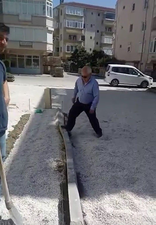 Bursanın Gemlik ilçesinde bir muhtar belediyenin yaptığı kaldırımları ayağıyla yıktı.