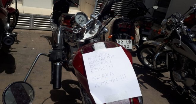 Adıyamanda, ismi öğrenilemeyen bir motosiklet sürücüsü benzin damlatan motosikletinin üzerine, “Benzin kaçırıyor dikkat edin, sigara içmeyin” yazılı kağıt yapıştırdı. Uyarı yazısını gören bazı vatandaşlar şaşkınlıklarını gizleyemezken bazı vatandaşlar ise sürücünün duyarlılığından bahsetti. Sürücünün yaptığı uyarıyı gören vatandaşlar motosikletin fotoğrafını çekmeyi de ihmal etmiyor.