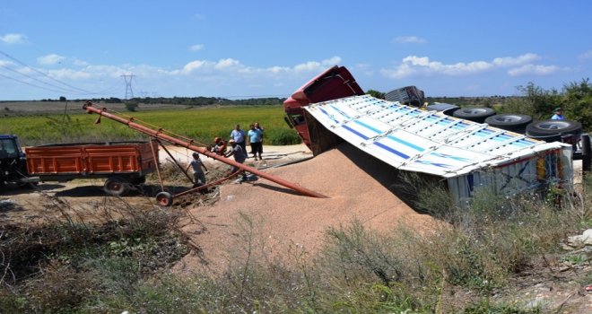 Bigada Buğday Kepeği Yüklü Kamyon Devrildi