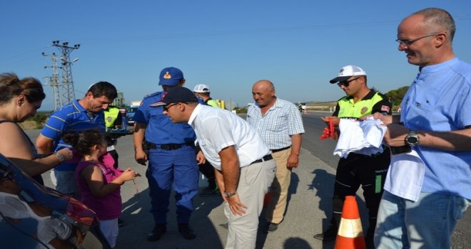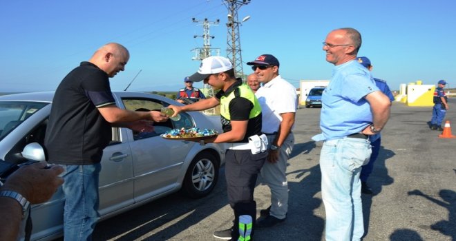 Çanakkalenin Biga ilçesinde, ‘Bu bayram bende trafik polisiyim, hatalı sürücüye kırmızı düdük projesi kapsamında araçlardaki çocuklara kırmızı düdük, tişört ve broşür dağıtıldı.