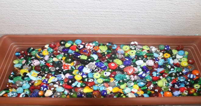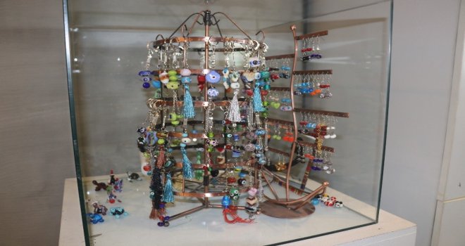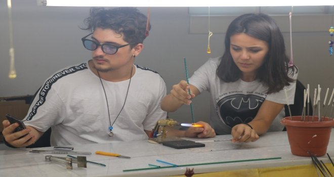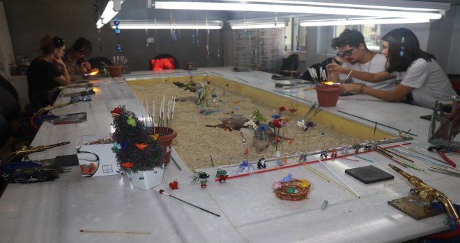 Gaziantepte Kültür Sanat Merkezine dönüştürülen Eski Adliye binasında kurulan cam atölyesinde ince cam çubuklar bin derece sıcaklıkta eritilerek küçük oyuncaklar, boncuk, kolye, bileklik, yüzük, küpe, anahtarlık ve çeşitli sanat eserleri yapılıyor.