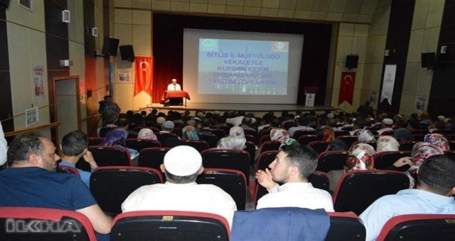 Bitlis İl Müftlüğü tarafından cami imam hatiplerine ve Kuran kursu hocalarına yönelik Vekaletle Kurban Kesim Organizasyonu tanıtım programı düzenlendi. Bitlis Kültür ve Turizm Müdürlüğünün konferans salonunda düzenlenen program, Kuran-ı Kerim tilavetiyle başlayıp, Diyanet Vakfı tarafından kurban organizasyonuyla ilgili hazırlanan sinevizyon gösterimiyle devam etti.