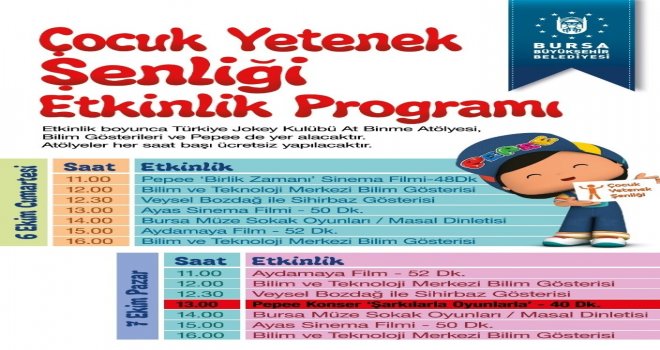 Bursa Büyükşehir Belediyesinin destekleriyle düzenlenen Çocuk Yetenek Şenliğinde çocuklar kabiliyetlerini keşfedecek.