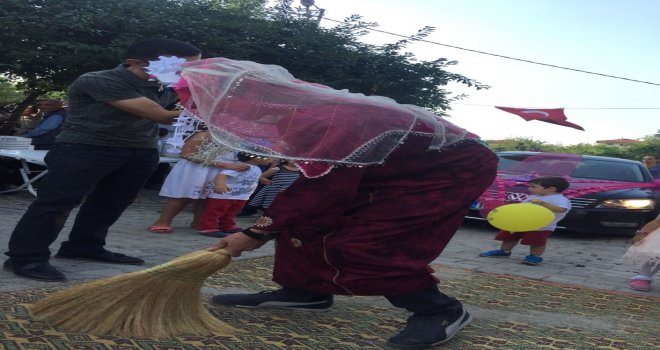 Davul zurna eşliğinde gelin evinden alınırken, damadın arkadaşları ise Fatihe geleneklerini eve girmeden yaşattı. Fatihe yöresel kıyafetler giydiren arkadaşları, makyaj yapmayı da ihmal etmedi. Evin önüne serilen halı ise damada el süpürgesi ile temizletildikten sonra tüpün üzerinde kahve yapması istendi.
