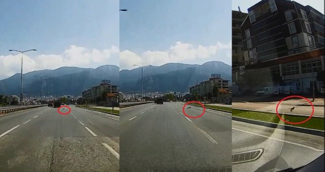 Bursanın Yıldırım ilçesi 11 Eylül Bulvarında yaşanan olayda plakası alınamayan aracın motor kısmında kaçak yolculuk yapan kedi seyir halindeki araçtan düştü. Birkaç takla attıktan sonra kendine gelen kedi, araçların altında kalmaktan son anda kurtuldu. Kedi kendini yol kenarına atarak gözden kayboldu.
