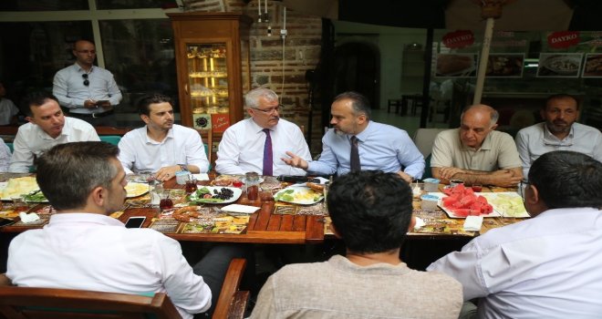 Tarihi Fidan Handa düzenlenen kahvaltılı programda esnafla buluşan Başkan Alinur Aktaş, yapılması gerekenleri ve beklentileri birinci ağızdan dinledi. Genel Sekreter Yardımcısı Ahmet Aka, Zabıta Dairesi Başkanı Enver Karakoç, Basın Yayın ve Halkla İlişkiler Daire Başkanı Ahmet Bayhan, Tarihi Çarşı ve Hanlar Birliği Başkanı Muhsin Özyıldırım ve Pazarcılar İşletme Kooperatifi Başkanı Mehmet Çakmakın hazır bulunduğu buluşmada, esnaf fikir ve görüşlerini dile getirdi.