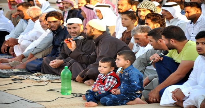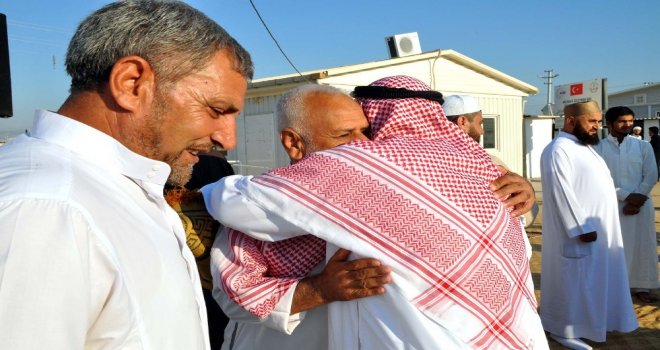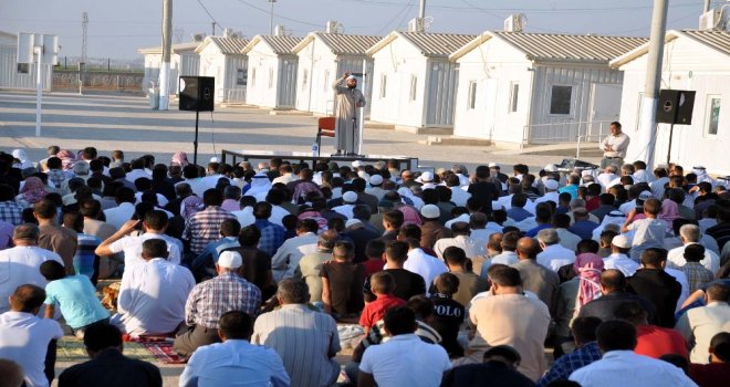 Ülkelerinde çıkan iç karışıklıktan dolayı, Türkiyeye sığınmacı olarak gelen 23 bin Suriyeli bayramı çadır kente buruk bir şekilde kutladı. Çadır kentte bayram namazı bir gün öncesinden hazırlanan meydana halılar serilerek namaz yeri hazırlandı. Suriyeli mülteciler bayram namazında birlikte saf tutarak bayram namazını kıldılar. Bayram namazının ardından hutbe verildi. Hutbede Suriyeli imam, birlik ve beraberliğe vurgu yapılarak, kendilerini ağırlayan Türk hükümetine ve Türk halkına teşekkür etti. İmamın hutbesinde Değerli kardeşlerim, bildiğiniz üzere 14. bayramdır ülkemizden uzakta buruk bir sevinçle bayram namazlarımızı kılmaktayız. Şunu unutmayın ki eğer birlik ve beraberliğimizi sağlayamazsak bu savaş daha da uzayacaktır. Evet hem hüzünlüyüz hemde sevinçliyiz. Bayramdır sevindik, ancak 7 yıldır ülkemizden uzakta ve vatanımızdan ve sevdiklerimizden uzağız.Ne zaman bitecek bu kavga,ne zaman bitecek bu hüzün.Hüzne biz doyduk, dünya daha ne kadar seyredecek bu savaşı. Kardeşlerim, tefrikaya ve ırkçılık ayrımcılığına düşmeyin. Biz ümmetiz. Bu işin Arabı, Kürdü ve Türkü yoktur. Evet, birlik olmadığımız için orta doğunun her yerinde kan akmaktadır. Bu bizim ayıbımız. Bir an önce birlik ve beraberliğimizi sağlayarak bu başıboşluktan kurtulmalıyız. Evet, bayramın hatırına bir birimize sarılalım ve aramızdaki nifak tohumlarını kurutalım. Allahın rahmeti ve bereketi üzerinize olsun ifadeleri yer aldı. Dua sırasında bazı yaşlı Suriyeliler, göz yaşlarını tutamadı. Namazın ardından tekbir sesleri çekildi ve bayramlaşma yapıldı. Bayramlaşma sırasında bir birine sarılarak kucaklaşan Suriyeliler duygusal anlar yaşadı.