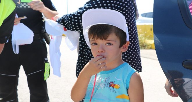 Trafikte seyir halinde bulunan araçlar durdurularak, araçtaki çocuklara anne ve babalarını hatalı trafik kuralları konusunda uyarmaları için bilgilendirme yapıldı. Çocuklara kırmızı düdük ile şapka ve tişört hediye edildi. Polisin verdiği düdüğü çalan çocuklar, hata yaptıklarında anne ve babalarını uyaracaklarını ifade ettiler.