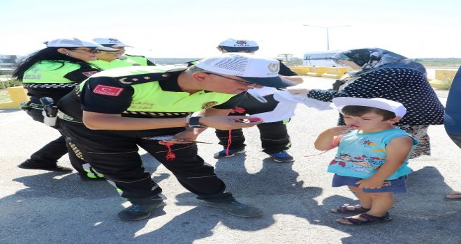 Çanakkalede, ‘Bu bayram ben de trafik polisiyim, hatalı sürücüye kırmızı düdük projesi kapsamında, araçlardaki çocuklara kırmızı düdük, tişört ve broşür dağıtıldı.