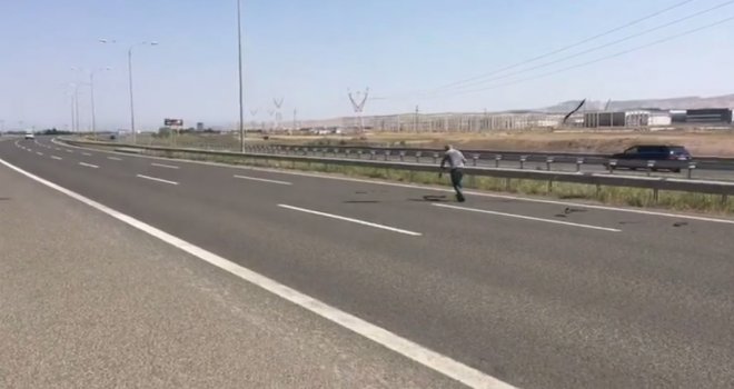 Aracından inen Alan, otoyol üzerinde seyir halinde olan diğer sürücülerin kaza yapmamaları için kontrollü bir şekilde yol üzerindeki büyük lastik parçalarını tek tek topladıktan sonra tekrar otomobiline bindi.