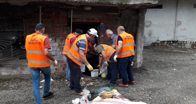 Ordunun Fatsa ilçesinde bir ihbarı değerlendiren belediye ekipleri çöp biriktirilen evi tamamen temizleyerek hem evin içini hem de çevresini dezenfekte etti.