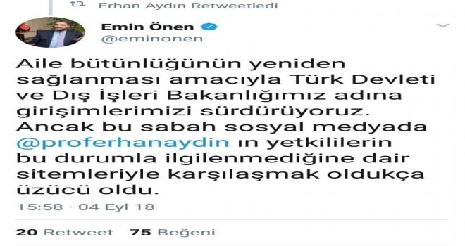 İnönü Üniversitesinde öğretim üyesi olarak görev yapan Prof. Dr. Erhan Aydın, 5 ay önce Çin Sincan Uygur Özerk Bölgesinin başkenti Urumçiye giden eşi Yrd. Doç.Dr. Mihriban Tursun Aydının geri dönüşüne izin verilmediğini belirterek sosyal medya aracılığı paylaşımda bulundu. Aydının bu paylaşımı üzerine ise yine sosyal medyadan açıklama yapan Türkiyenin Pekin Büyükelçisi Abdulkadir Emin Önende “Aile bütünlüğünün yeniden sağlanması amacıyla Türk Devleti ve Dış İşleri Bakanlığımız adına girişimlerimizi sürdürüyoruz. Ancak bu sabah sosyal medyada Prof.Dr. Erhan Aydının yetkililerin bu durumla ilgilenmediğine dair sitemleriyle karşılaşmak oldukça üzücü oldu” ifadelerini kullandı.
